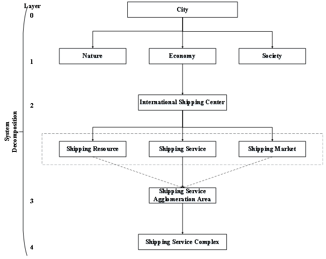 Theoretically, the SSC is an open system, which means it not only exchanges basic elements such as information, material and energy internally, but also has dynamic interaction with the outside world. Therefore, the larger urban system should be taken into consideration to analyze the system structure of the shipping service complex as a whole.