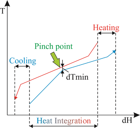 Heat integration and PA can be presented with composite curves (see Figure 3). On the graph composite curve are plotted with hot streams (red) and cold streams (blue). The area where the two curves overlap, heat integration takes place (heat can be reused). On the left-hand side of the graph, hot streams are to be cooled (cooling) down, while on the right-hand side of the graph, cold streams need to be heated (heating)
