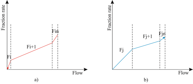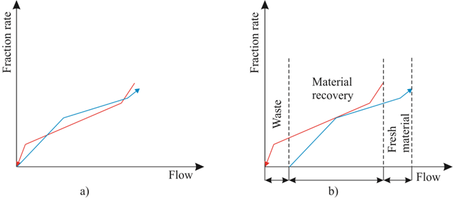 Similarly, to Heat integration, recycling of CMs can be graphically depicted using PA. In material recovery, hot and cold streams are replaced with source and sink streams (flows) and are represented with red and blue lines, respectively (see Figure 4a and Figure 4b). Composite curves are obtained by connecting all flows, starting from the one with lowest, and ending with the one with highest fraction rate. Furthermore, at source curve the fraction rate is decreasing from right to left, while at demand curve the fraction rate is increases from left to right.