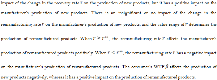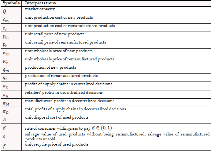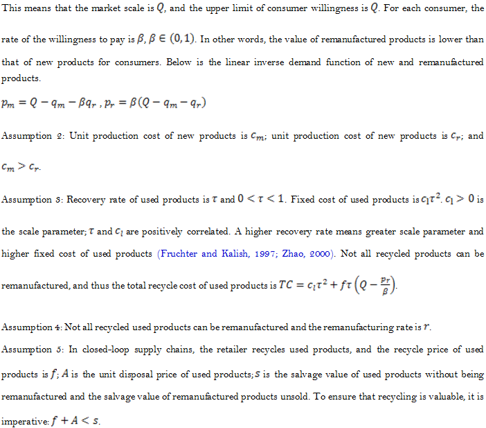 Willingness to Pay (WTP) is what consumers are willing to pay for certain goods and services, which is also the evaluation of a product and service. WTP in this article varies when consumers choose new and remanufactured products; in other words, consumers can differentiate new and remanufactured products. Shi et al. (2015) look at the competition in remanufacturing when the supply chain consist of manufacturers who use new products and remanufacturers who recycle core components, they find that WTP has a significant impact on the manufacturer's performance and the stability of Nash equilibrium. Since the remanufacturing technology develops relatively slowly and consumer awareness of remanufactured products is inadequate, the willingness to pay for remanufactured products is relatively low. However, recovery rate and remanufacturing rate can be a very beneficial perspective in the study of closed-loop supply chains of remanufacturing. In these perspectives, here the consumer willingness to pay varies; that is, consumers show different levels of acceptance of new and remanufactured products. Not all used products can be recycled and not all recycled products can be remanufactured, and as a result, the impact of recovery rate and remanufacturing rate on the pricing strategy of closed-loop supply chains are investigated.