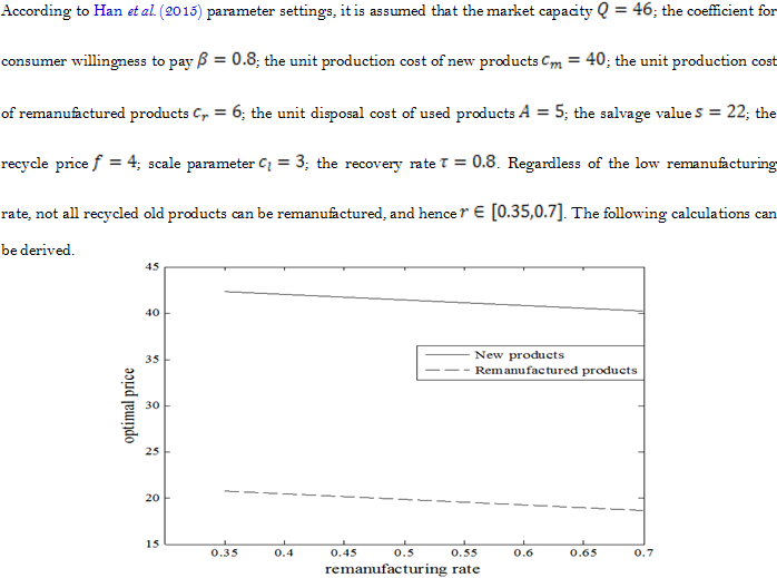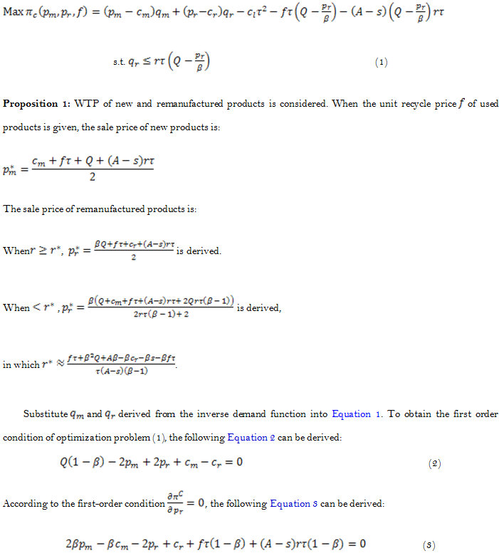 Earlier studies have stated that new and remanufactured products are homogeneous, which does not conform to the reality. The current studies assume that there is discrepancy between new and remanufactured products; in other words, consumers can distinguish between them. There is difference in WTP for new and remanufactured products. Xiang et al. (2009)note that the cost savings from remanufacturing is inversely proportional to recycling cost of used products in centralized decisions when new products differ from remanufactured products. The increase in remanufacturing cost saved can stimulate recycling behavior. Michaud and Llerena (2011) examine the impact of characteristics of remanufactured products on consumer willingness to pay by auction experiments. They show that consumers tend to value remanufactured products less than conventional products; that is, the value of WTP of remanufactured products is less than that of conventional products. Guo et al. (2012a) show that the price of new and remanufactured products in centralized decisions is lower than that in decentralized decisions, thereby leading to higher profits for the overall supply chain when consumer willingness to pay for new and remanufactured products varies. Guo et al. (2012b) consider three modes in which the manufacturer recycles, the retailer recycles and the third party recycles when demand is uncertain and WTP for new and remanufactured products varies, noting that the profits of supply chains are maximal when a third party recycles.