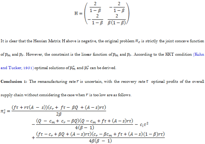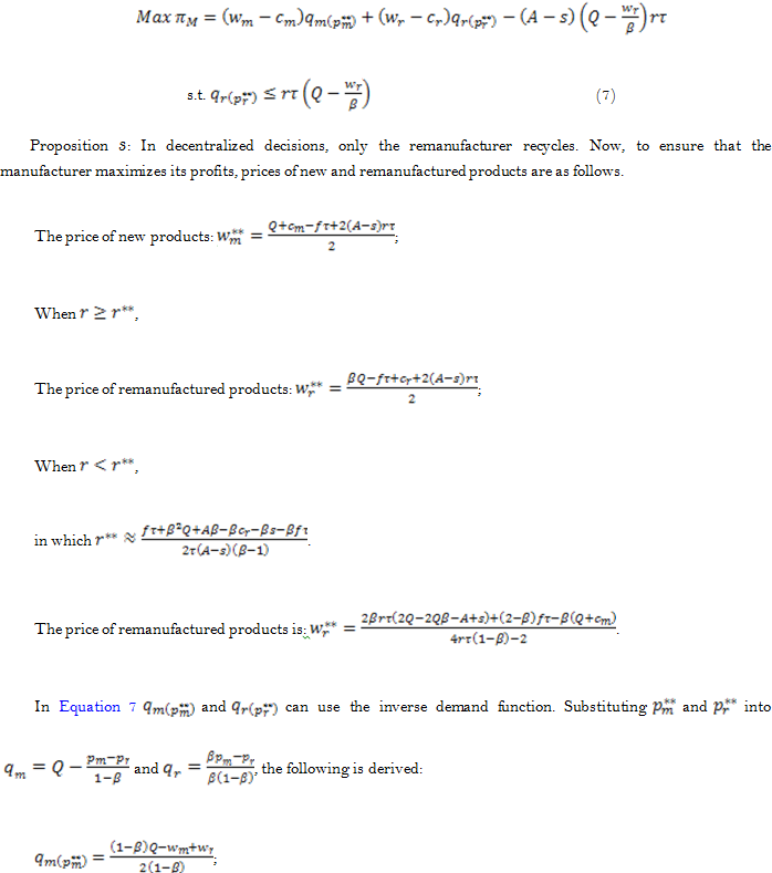 This part concerns the manufacturer’s decision problems in decentralized decisions. In this decision, when WTP of new and remanufactured products varies, the manufacturer’s profits come primarily from sales of new and remanufactured products with uncertain remanufacturing rate. Also, inventory and stock-out are not considered, and only the remanufacturing cost is taken into account. Below are the specific optimization problems: