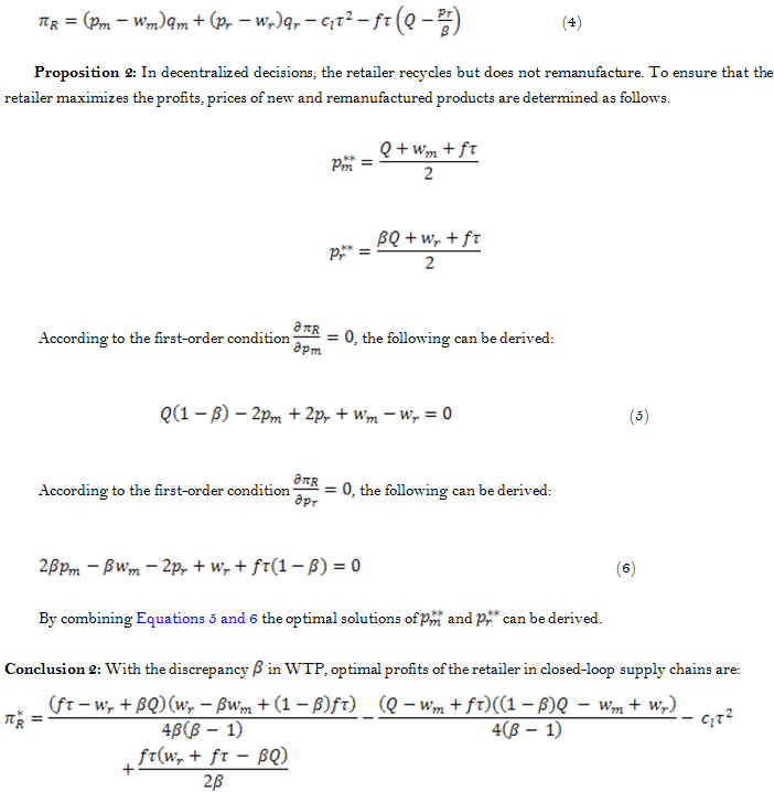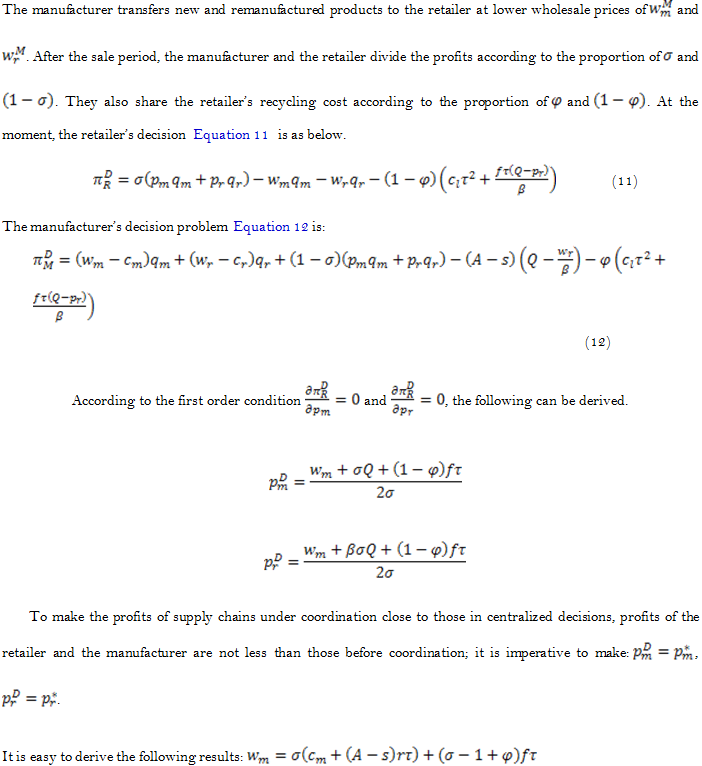 In the decentralized model of closed-loop supply chains, profits of participants come from the sale of new and remanufactured products. In decentralized decisions, according to the Stackelberg game theory, the manufacturer serving as a leader in the channel first determines the optimal price of new and remanufactured products. Here, it is assumed that all participants in the supply chain are risk neutral and seek profits, and they have access to the same information. The solution of the optimal pricing strategy of the retailer and the manufacturer is derived from backward induction.