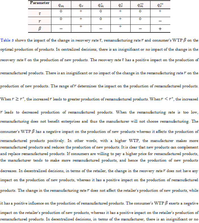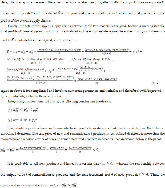 The analyses above show that the price of new and remanufactured products in closed-loop supply chain varies in centralized and decentralized decisions and the profit of the entire supply chains also differ.