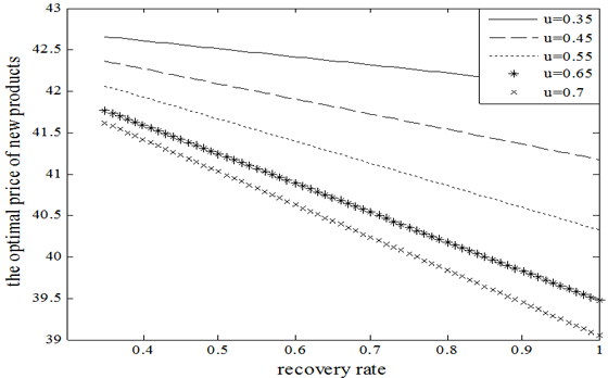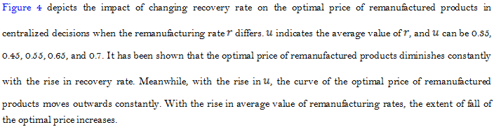 Figure 2 shows that as the remanufacturing rate increases continuously, the optimal price of new and remanufactured products falls in centralized decisions. It also shows that with uncertain recovery rate, increase in remanufacturing rate leads to lower optimal price of new and remanufactured products. With the constantly rising remanufacturing rate, the extent of fall in the optimal price diminishes, indicating that the impact of remanufactuirng rate on the optimal price of new and remanufactured products reduces when the remanufactuirng rate increases to a certain extent. The figure illustrates that the price of new products is apprarently higher than that of remanufactured prices, because of the WTP discrepancy between new and remanufactured products. Consumers tend to prefer new products.