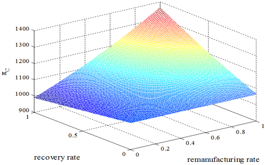 AS Figure 7,for a better understanding of the impact of recovery rate on the optimal profits when WTP varies between new and remanufactured products, the numeric assumptions above are still deployed to construct a three-dimensional diagram that shows the effects of variations of both rates on the optimal profits. It depicts the impact of uncertain recovery rate and the remanufacturing rate on the total profits of supply chains with WTP. The diagram illustrates that the total profits of the manufacturer increase in centralized decisions when the remanufacturing rate and recovery rate are on the rise.