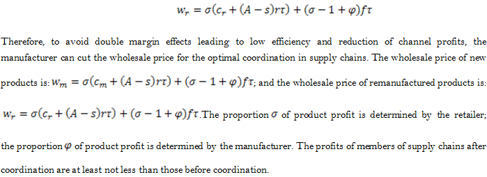 However, there are some limitations in this study. This article only considers the closed-loop supply chain consisting of a single manufacturer and a single retailer; however, our future study can investigate complicated closed-loop supply chains composed of duopoly manufacturers and retailers, and also multiple manufacturers and retailers may compete. The impact of the remanufacturing rate and the recovery rate on the pricing strategy of closed-loop supply chains can also be examined in the context of competition. Meanwhile, it is assumed that all participants are risk neutral and pursue profits and have access to the same information; nevertheless, participants in reality may have asymmetrical information, and our future study may involve participants with asymmetrical information. This article merely considers the pricing strategy of closed-loop supply chains in a single period, whereas our future research may concern the pricing model in two periods.