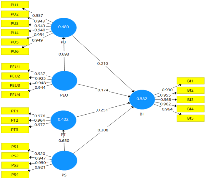 This study revealed the effects of perceived usefulness, perceived ease of use, perceived trust and perceived security on behavioural intention to use smartphone banking applications. Firstly, perceived usefulness found to have a significant influence on behavioural intention (H1 was supported). In this study, respondents admitted that smartphone banking application is very useful such as it saves time, convenient and transactions are effortless. Gu, Lee, and Suh (2009) studied behavioural intention to use mobile banking and found perceived usefulness as the most important construct and the key determinant of behavioural intention to use technology. Secondly, easy to use smartphone banking apps influences perceived usefulness and behavioural intention to use (H2a and H2b were supported). Consumers perceived that the more it is easy to use the smartphone banking application the more likely to be useful thus consumer intend to behave on a given technology. The result was following a prior study of Karim et al. (2020) which revealed that perceived ease of use did have an impact on perceived usefulness and consumers' behavioural intention. Next, perceived security found to be significant with behavioural intention to use and perceived trust (H3a and H3b). Consumers expect bank to ensure the security system to be strengthened, particularly over wireless networks, where they expect protection of transactions and privacy Singh and Srivastava (2018). Lastly, perceived trust found to be significant with behavioural intention to use smartphone banking application (H4 was supported). Although the study of (Singh & Srivastava, 2018) found an insignificant relationship between perceived trust and behavioural intention to use mobile banking in developing countries like India, the current study shows the significant relationship with behavioural intention to use smartphone banking applications among millennials in Malaysia.