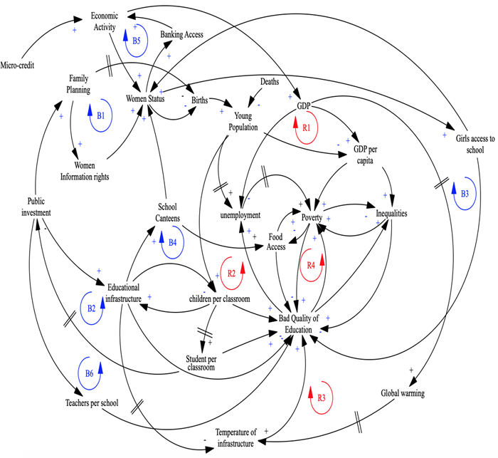 It is possible to balance these effects via loops B1, B2, B3, B4 and B5. Loops B1, B4 and B5 relate more specifically to an improvement in the status of women. Loop B1 includes a mechanism for regulating the population through family planning and information on women's rights. Loop B5 relies on micro-credit to develop women's economic activities (entrepreneurial status) and enable them to access bank loans. Loop B4 introduces the idea that the existence of school canteens promotes the emancipation of women and the presence of children in school. Loops B2 and B6 consider that the State must invest in school infrastructure in primary and secondary schools, but also in higher education (an increase in the birth rate will result 18 years later in a massive flow of students to university). This public investment must also take the form of teacher recruitment, which could reduce the number of children per class. It should be noted that the recognition of a real status for women (B3) can only improve girls' access to school.