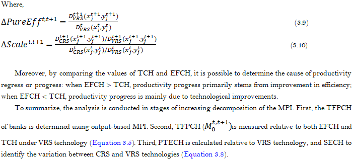 Efficiency and productivity are interrelated in the current study: changes in the former are affected by alterations in the latter. The input–output ratio can be used to determine productivity, but it is important to remember that efficiency fails to take account of the time taken by the production process. Therefore, MPI,sometimes referred to as TFP, has been widely adopted for DEA in a range of countries and sectors due to its ability to assess any change in efficiency or technology in terms of progress or regress over time. Output-based MPIis used to not only measure and understand the change in productivity of banks but also to determine the change in TFP (TFPCH), which can be decomposedinto technical change (TCH) and efficiency change (EFCH). In addition,EFCH can be further decomposed into changes in scale efficiency (SECH) and pure technicalefficiency (PTECH). Figure 1 illustrates these interactive relationships.