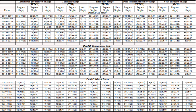 To control for possible outliers, Table 5reports the trend in the number and percentage of all banks that experienced a productivity progress or regress during the study period. It can be seen fromTable 5 Panel Athat only 121 (35.80%) of all banks experienced productivity progress in 2008,but then increased substantially to a maximum of 206 (56.13%) banks by2013, before declining to 142 (38.38%) banks in 2017. Technical progress also increased from 157 (46.45%) banks in 2008 to 232 (63.22%) in 2013,and then drastically declined to 76 (20.54%) banks in 2017. These figures were validated by the banks that experienced technical regress, which declined from 174 (51.48%) banks in 2008 to 134 (36.51%) 2013,then radically rose to 294 (79.46) in 2017.