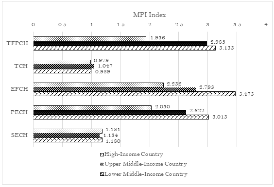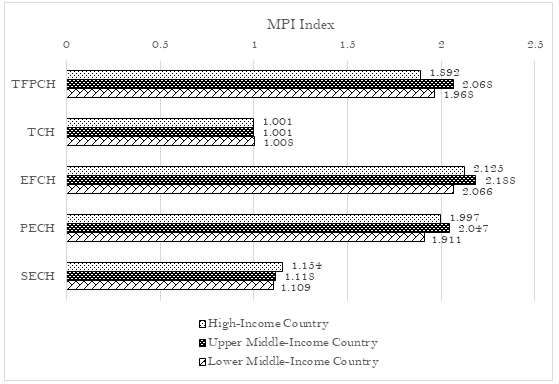 Figure 3 represents the TFPCH of Islamic banks in high-, upper middle-, and lower middle-income countries from 2008 to 2017. Overall, high-income countries have the lowest TFPCH, TCH, EFCH, and PECH,while lower middle-income countries have the highest TFPCH, EFCH, PECH, and SECH, andthe upper middle-income countries have slightly higher TCH than the other countries.