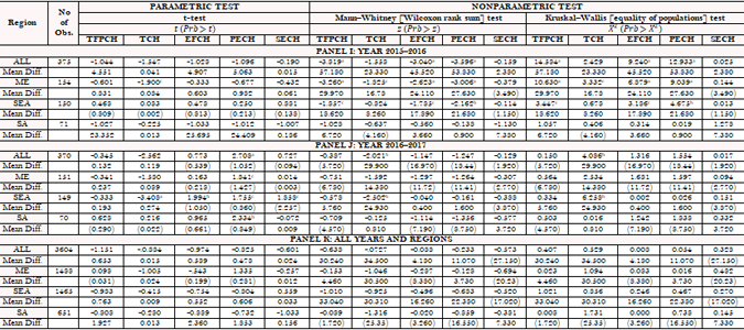 Table 6 presents the results of the parametric (t-test) and nonparametric (Mann-Whitney [Wilcoxon] and Kruskal–Wallis) testsand reveals the significant difference between the productivity levels of Islamic and conventional banks in specific years and regions. As already observed,it appears that Islamic banks are slightly more productive than conventional banks across all regions;however, the difference is only statistically significant during 2016 (Panel I). On the other hand, the t-test results, confirmed by the nonparametric tests, in Panels A, C, F, and H suggest that conventional banks were relatively more productive, though only statistically significant in 2010 (Panel C).