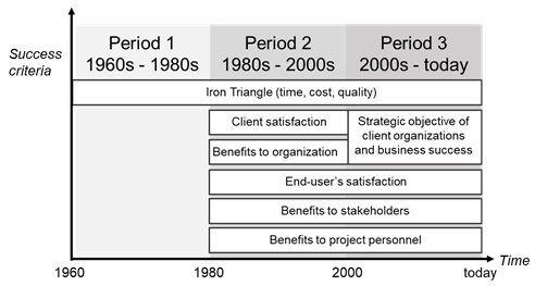 Few people would disagree with the statement that project success is interpretable in many ways. It is, simply put, a rather “elusive concept” (Prabhakar, 2008). Most early research on project success seems to emphasize the three traditional dimensions: (within) time, (within) budget and (within) specification (Albert, Balve, & Spang, 2017) also known as the known ‘iron triangle’, “despite the fact that this method is currently subject to widespread criticism” (Bakker, Boonstra, & Wortmann, 2010). However, starting around the early 80s of last century, other criteria of success emerged from literature, such as “measuring success after delivery” that “involves looking at the benefits or effectiveness of the project from the perspective of the stakeholder” (Jugdev & Müller, 2005). Based on a structured review of relevant studies, Ika (2009) analysed the development of criteria used to assess project success. Figure 1 visualises the development of success criteria he identified.