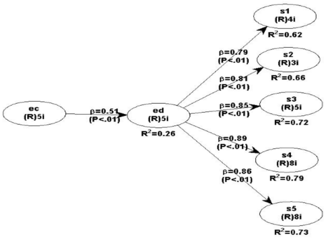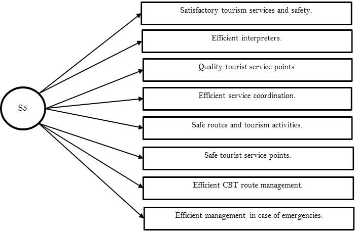 As illustrated in Figure 5, for the factors of sustainable tourism development as described in the five dimensions, the sustainable tourism development in the communities (s4) has the highest effect (0.89) with a confidence level of 99%. Good quality of life, economic, and social management (s1) = 0.79 with a confidence level of 99%. Cultural heritage conservation and promotion (s2) = 0.81 with a confidence level of 99%. Systematic and sustainable resource and environmental management (s3) = 0.85 with a confidence level of 99%. Services and safety (s5) = 0.86 with a confidence level of 99%.