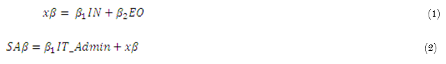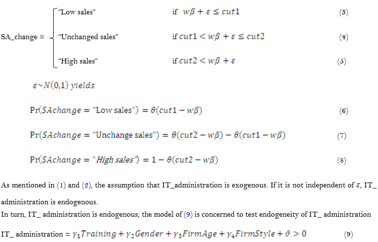 Drukker (2017) developed the Extended Regression Model (ERM), in which Drukker also published the Extended Ordered Probit Regression Model (EOPR) to find out whether unobserved factors as endogenous variables have a potential impact on the regression. Dependent variables employed in ERM can be continuous (for linear) and ordinal values (ordered probit). Accordingly, the model of order profit is concerned in this study and its common model is mentioned in (1) and (2). In which the function (1) presents two exogenous variables in the function, e.g. IN and EO. The function (2) presents a relationship between SA (sales growth) and IT administration (Application of information technology on entire administration system).