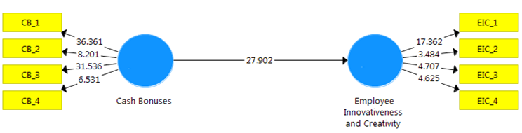 Following the satisfactory results of the measurement model, the next stage in the analysis was to employ the structural model for hypothesis testing. To achieve this, the PLS-SEM software bootstrapping structural analysis procedure was used to determine the structural effect of cash bonuses on employees’ innovativeness and creativity in the Nigerian banking sector. The results in Figure 3 and Table 3 indicate the effect of the independent variable on the dependent variable in the study.