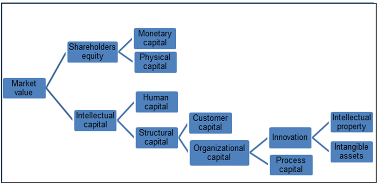 According to this scheme, the combination of IC and shareholders’ equity determine the overall market value of a firm. Therefore, the exclusion of any of these elements would result in an increase in the difference between book and market value. Shareholders’ equity, which represents monetary and physical capital, is properly captured and presented by a company's financial statements. However, the recognition of IC in financial statements is not allowed by any standard in place to date.