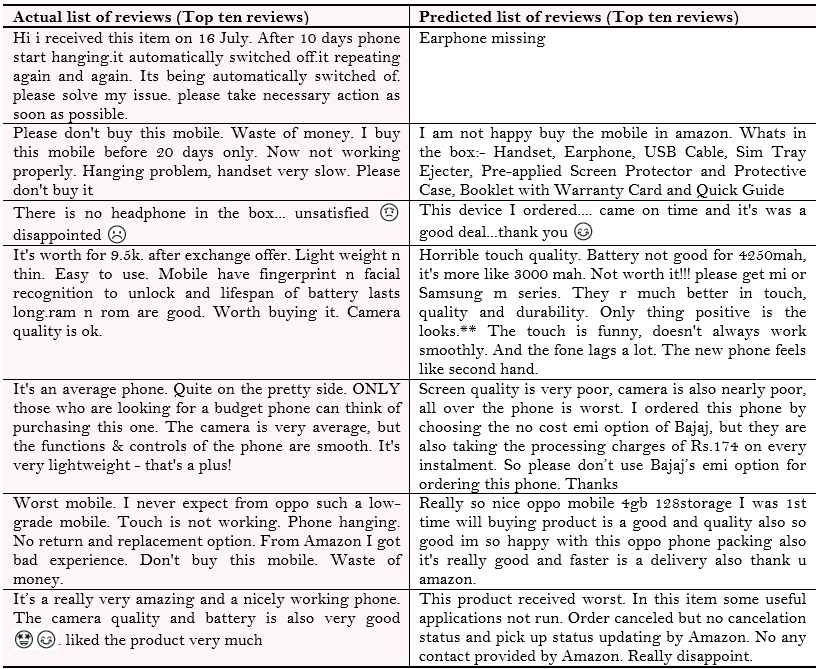Table 4. Actual and predicted lists of top 10 reviews.