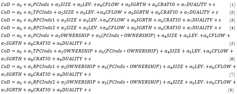 Equations 1, 2, 3 and 4 present the multiple regression models to test the relationship between the cost of debt and firms with PCIDs to test the first hypothesis. In addition, Equations 5, 6, 7 and 8 argue the interaction of corporate ownership and test our second hypothesis in this study.