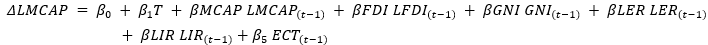 The shot-term relationship is evaluated using the ECM. The levels equation (βMCAP=βFDI=βGNI=βLER=βLIR=0) is tested to check the possibility of the short run co-integration among variables. The magnitude and influence of the co-integrated variables are calculated considering the dynamic nature of co-integration in the short-term.