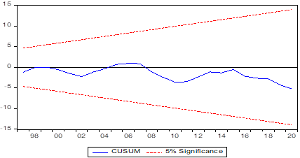 Since the model passed all the diagnostics, its fitness is established. The stability of the model is assessed using the Cumulative Sum (CUSUM) and sum of Square Tests. The Results of the CUSUM Tests are given below.