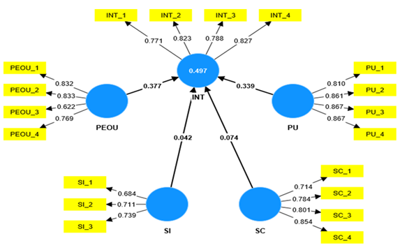 Table 1 shows that PU has the highest CA score of 0.873. Perceived usefulness is the most reliable of the five variables. The lowest SI score is 0.547, which is unacceptable. INT, PEOU, and PU are acceptable and good variables. Due to a low question count, SI is poor.