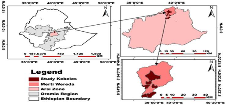 The study was conducted in Merti woreda Arsi Zone Oromia regional state, Ethiopia. Merti woreda is located 168kms south east of Addis Ababa, the capital of the Federal Democratic Republic of Ethiopia (Figure 1). Merti woreda is geographically found between at 08˚23' -08˚43'N latitude & 39˚50'-40˚0'E longitudes. The altitude of this Woreda ranges at 1780 meters above sea level. The normal mean annual rainfall ranges from 750 – 1500mm and the maximum and minimum temperature in most case found in the range 20 - 25 °C and 10 – 15 °C respectively. Rain-fed agriculture mainly cereal cropping along with livestock raring are the major sources of food and income for maintaining the livelihoods. Barley and Wheat are the main crops in the highlands and midlands (Dega and Weina Dega), and maize and millet or sorghum in the lowlands (kola) with restricted intercropping opportunities due to poor soil composition [12].