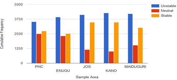 Figure 2 show the cumulative pattern of PG stability classes as well as the major stability group with unstable category (A+B+C), neutral category (D) and stable category (E+F+G). This indicates the cumulative pattern of atmospheric stability conditions across study areas. It can be observed that the percentage cumulative PG stability classes over study areas across Nigeria showed this trend: Unstable>Stable>Neutral atmospheric conditions. Figure 2 also show that unstable conditions increased from the coast of Port Harcourt towards the far northern fringes while stable periods are higher in Jos, Kano and Maiduguri than in Port Harcourt and Enugu. Neutral condition is more prominent in the southern coast than the northern domain.