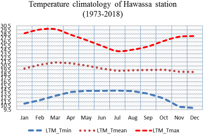 The minimum and maximum temperature has recorded in the station. The highest levels of maximum temperature were recorded in the months of March exceeding 29.7 °C whereas the lowest levels of maximum temperature were recorded during months of July and not exceeding 24.2 °C Figure 4. Furthermore, January, February and December were the months of high variations of monthly temperature recorded. Besides, May was the month of high deviation of temperature occurrence the lowest levels of minimum temperature were recorded during months of December and January less than 10.0°C were recorded.