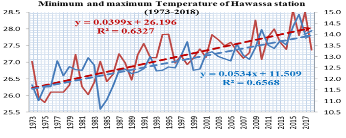 Figure-5. Trends of maximum and minimum temperature for Hawassa station (1973-2018).