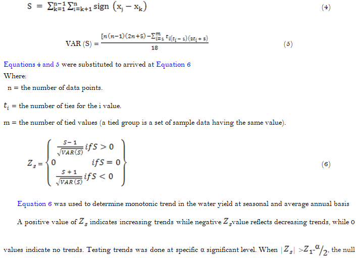 To achieve part of objective, Mann-Kendall test [19, 20] was applied to detect the monotonic trends in projected water yield time series. The Mann-Kendall statistical test has been frequently used to quantify the significance of trends in hydro-meteorological time series [21-23]. This is calculated as: