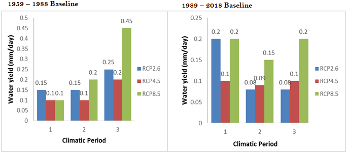 Trend analysis in SRB under the 2019-2048 periods Table 2 shows no significant increasing trends at 0.05 significant levels for all the three emission trajectories. Likewise, in KYB average annual water yield reveals (+0.09 to 0.12 mm/day) range of increase under the 1959-1988 baseline for all the RCPs, but sharply decreases to the range of (+0.05 to +0.08 mm/day) under 1989-2018 baseline with RCP8.5 having the highest value and least being RCP2.6. However, the trend analysis over KYB under the (2019-2048) period shows that there are no significant increasing trends for all the three RCPs at 0.05 significant levels.