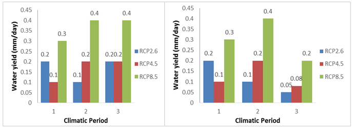 Near-term projection (2019-2048) period at KLB, wet season water yield will increase within the range of (+0.1 to +0.2 mm/day) for all the three RCPs under the two baseline periods of (1959-1988) and (1989-2018). RCP2.6 accounts for the highest increase of (+0.15 mm/day) and lowest being RCP4.5 and RCP8.5 with (+0.1 mm/day) under the 1959-1988 baseline, while a contrasting pattern of increase is observed under 1989-2018 baseline where RCPs 2.6 and 8.5 account for the highest with (+0.2 mm/day) and lowest been RCP4.5 Figure 3a. Trend analysis of wet season water yield within the 2019-2048 periods over KLB indicates that it is not significant at 0.05 significant levels for all the three RCPs Table 2. SRB wet season water yield reveals that the range of increase is between (+0.1mm to +0.3 mm/day) for all the three RCPs under 1959-1988 and 1989-2018 baselines. RCP8.5 accounts for the highest under the two baselines with (+0.3 mm/day) each, while RCP4.5 accounts for the lowest Figure 3b. Trend analysis of wet season water yield in SRB under the 2019-2048 periods shows significant increasing trend at 0.05 significant levels for scenarios (RCP2.6 and RCP8.5) but non-significant for medium emission scenario (RCP4.5) see Table 2. Similarly, condition over KYB reveals lower magnitude of increase compared to SRB at this period. Figure 3c shows (+0.1 to +0.2 mm/day) range of increase under the 1959-1988 baseline for all the RCPs, but sharply decreases to the range of (+0.05 to +0.1 mm/day) under 1989-2018 baseline with RCP8.5 having the highest value and least being RCP2.6. It is important to point out that the range of increase under 1989-2018 baseline is the same for KLB and KYB but differ greatly with SRB. However, the trend analysis of wet season water yield over KYB under the (2019-2048) period shows that there is significant increasing trend for RCP2.6 under 1959-1988 baseline but not under 1989-2018 baseline as well as for other two RCPs.