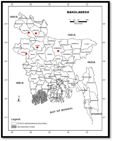 Figure-1. Bangladesh districts map and “red point “indicates research locations.