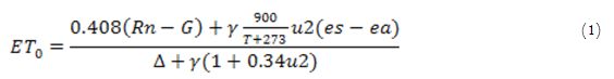 Reference crop evapotranspiration is the evaporative need of the surrounding atmosphere which is dependent on weather data (solar radiation, temperature, humidity and wind speed). It was calculated with the guide line of Allen, et al. [6].