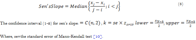 Mann-Kendall trend test was carried out whether there was any tend in crop water requirement, net irrigation water requirement, and irrigation parameter and the rate of change in time series data was estimated with sen’s slope, shown in Equation 8, which is non-parametric method with the framework of Gocic and Trajkovic [11].