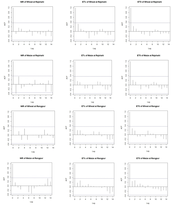 Figure-4. Autocorrelation (ACF) of net irrigation water requirement (NIR), crop water requirement (ETc), reference evapotranspiration (ET0) with different lags at Rajshahi and Rangpur from 1990 to 2018.