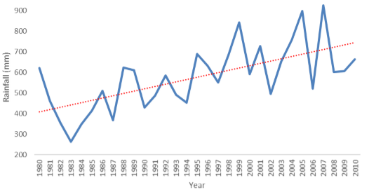 Figure 8 shows the variation of rainfall at Sokoto between the years 1980 and 2010, which indicates the presence of seasonality in the maximum and minimum amount of rainfall annually. Of the 372 months considered, 183 months experienced little or no rainfall, the maximum rainfall experienced at Sokoto in a month is 355.6 mm. An average amount of 645 mm rainfall was experienced between 1980 and 2010. To support the trend shown by the trendline, it was reported that in the year 2007 that over 5000 people were displaced due to the flood experienced. It was stated in the report that a Sokoto State Emergency Services’ official stated that the city of Sokoto has not experienced this kind of flood in many years [34].