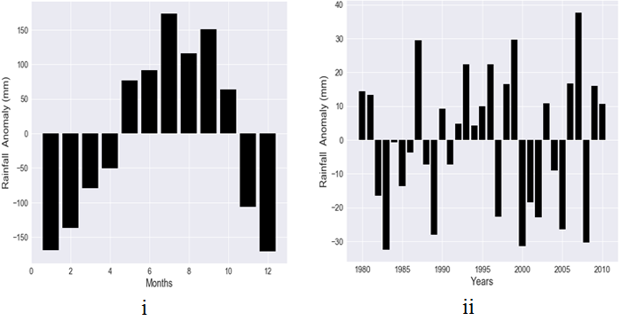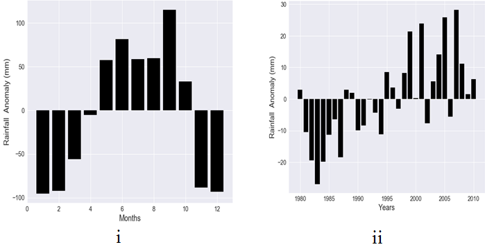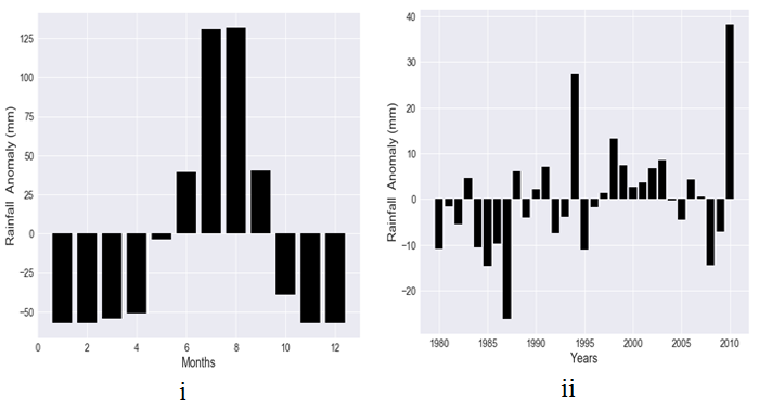 Figure 14 represents the plot of both monthly and yearly rainfall anomalies. From figure 14 i and ii, the negative deviation of rainfall that occurred in non-rainfall months (November to April) was equally as prominent as the positive deviation of rainfall that occurred in rainfall months (May to October), was the same. It was observed for the years that between the years 1980 to 2010, the negative anomaly of rainfall was less prominent than the positive anomaly of rainfall.