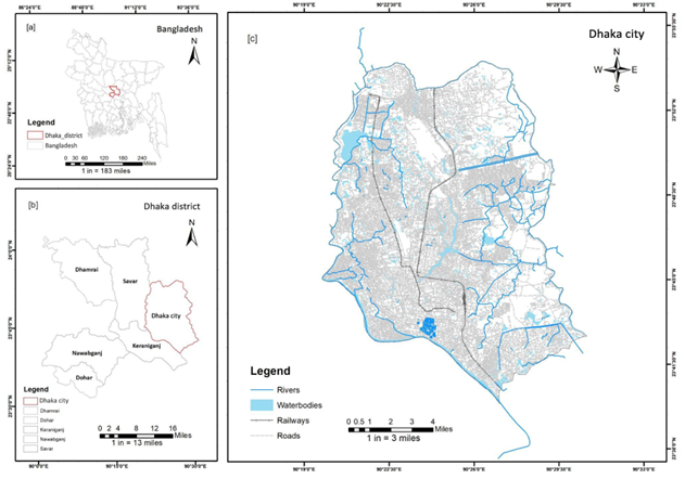The city is currently one of the most extensively industrialized regions in Bangladesh. This city is a renowned global city that serves as the home for several international organizations. The Globalization and World Cities Research Network classifies the city as a beta-global city due to its development into a megacity in the twenty-first century. Figure 1 illustrates the study area map.