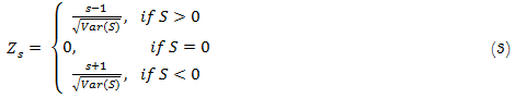 Equation 2 represents the difference between two variables xj, and xi. The significance of the trend is statistically quantified by calculating the probability associated with S and the sample size, n. Normalized test statistic ZS is computed in the following manner: