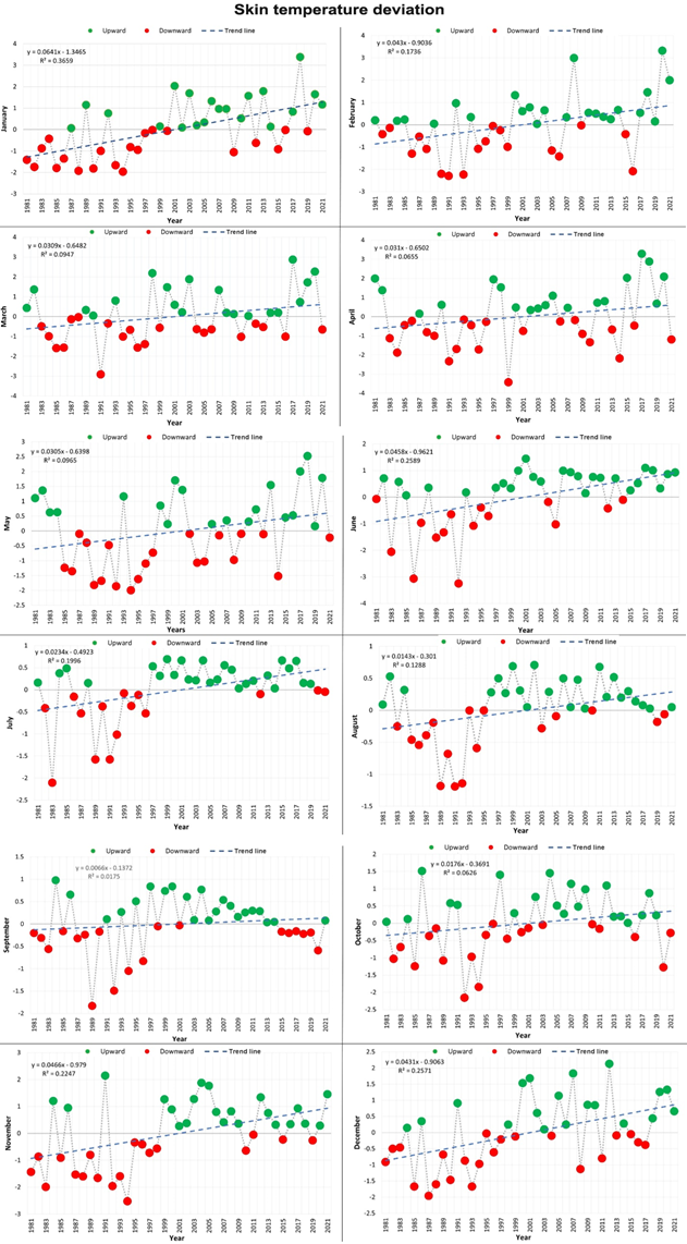 Figure 2. Illustrates temporal variation of skin temperature (°C) From 1981 To 2021 depicted in separate graphs for each month, composited to show the annual temperature patterns.