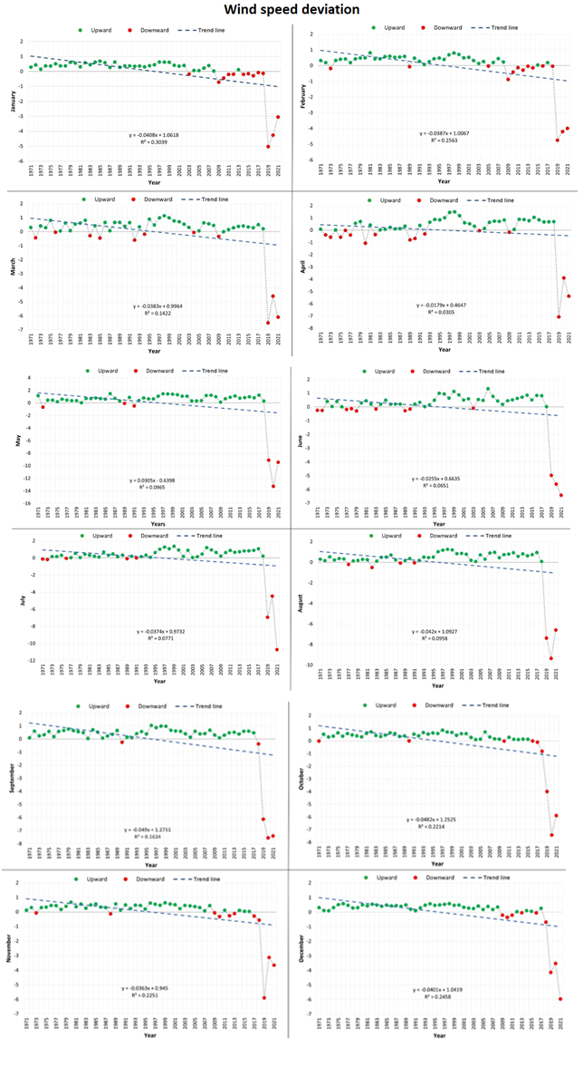 The annual Wind Speed value demonstrated a decreasing trend between 1971 and 2021. The pre-monsoon season displayed the highest monthly average Wind Speed, while the post-monsoon season recorded the lowest.