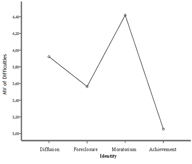 This relationship was investigated by applying the Single Factor Variance Analysis (ANOVA). Adolescents, depending on their type of identity, differed in the difficulty of making vocational decisions [F (3, 96) = 8.08, p < 0.001]. The subsequent Bonferroni testing showed that the mean value (MV) of difficulty for Moratorium adolescents (MV = 4.42 and SD = 1.10) was higher compared to Identity Achievement adolescents (MV = 3.05 and SD = 0.94) and to Identity Foreclosure ones (MV = 3.56 and SD = 1.15). A statistically significant difference was observed between adolescents with Identity Achievement and Diffusion (MV = 3.92 and SD = 1.09) (see Table 3 and Figure 1).