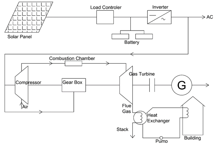 Furthermore, a computer simulation model of the behavior of photovoltaic PV and gas turbine hybrid system with compressed air storage was presented by Jaber (2004) to evaluate and predict performance of the total energy conversion efficiency under different operating conditions. He reported that his integrated PV gas turbine hybrid system produced approximately 140% more power compared to conventional gas turbine plants power.