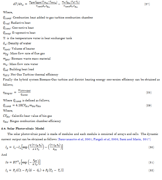 This study contributes to the existing literature of photovoltaic, biomass and district heating hybrid systems. This study uses a new approach in modeling the hybrid system by establishing the conservation and conversion equations, integrating, coding and solving them to obtain the dynamic behavior of the hybrid system.