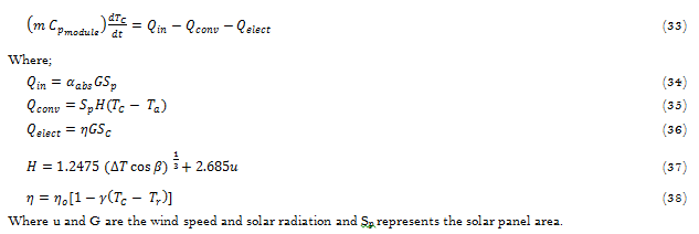 The PV cell temperature Tc is influenced by several factors such as solar radiation, ambient conditions, and wind speed. This parameter impacts the PV output current, and its time-variation can be determined from the following (Yang et al., 2007; Korzynietz et al., 2012)