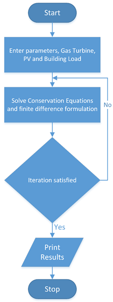 The energy conversion and heat transfer mechanisms taking place during the various processes shown in Figure.1, are described in equations (1) through (22). These equations have been solved as per the logical flow diagram presented in Figure. 2, where the input parameters of Biomass gas turbine, PV and the district heating as well as the various independent parameters are defined. Dependent parameters were calculated and integrated in the system with the finite-difference formulations. Iterations were performed until a solution is reached with acceptable iteration error.