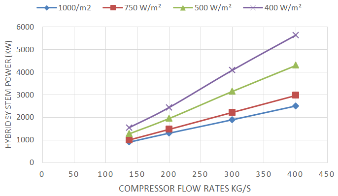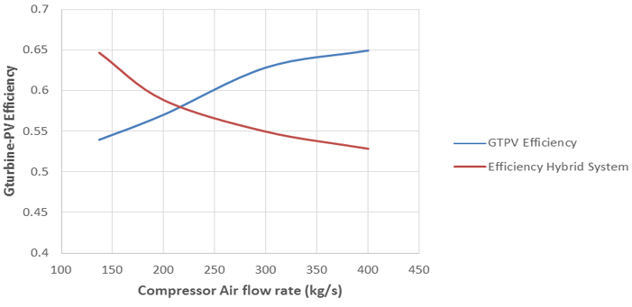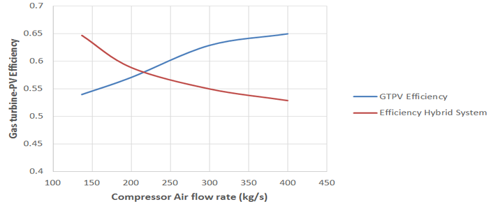 It is apparent from these figures that increasing air flow and consequently the flue gas flow rate enhances the output power produced by the gas turbine system and hybrid system. Furthermore, the higher the air flow rate the higher the efficiency of the gas turbine system with the compressor driven by PV solar panels. However, when taking into account the solar radiation converted by the solar panels the hybrid system efficiency diminishes with increasing the air compressor flow rate.